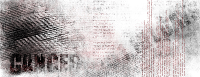 The paragraphs from the story form masses and globs reminiscent of the uncontrolled growth of cancer cells and create an erosion effect relating to cancer's damage.